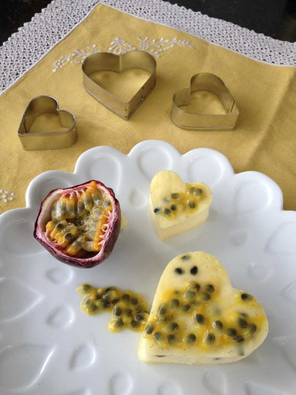 On each plate. Place a heart or two, topped with 1 tsp of passion fruit pulp. Serve with a half passion fruit on the side.
