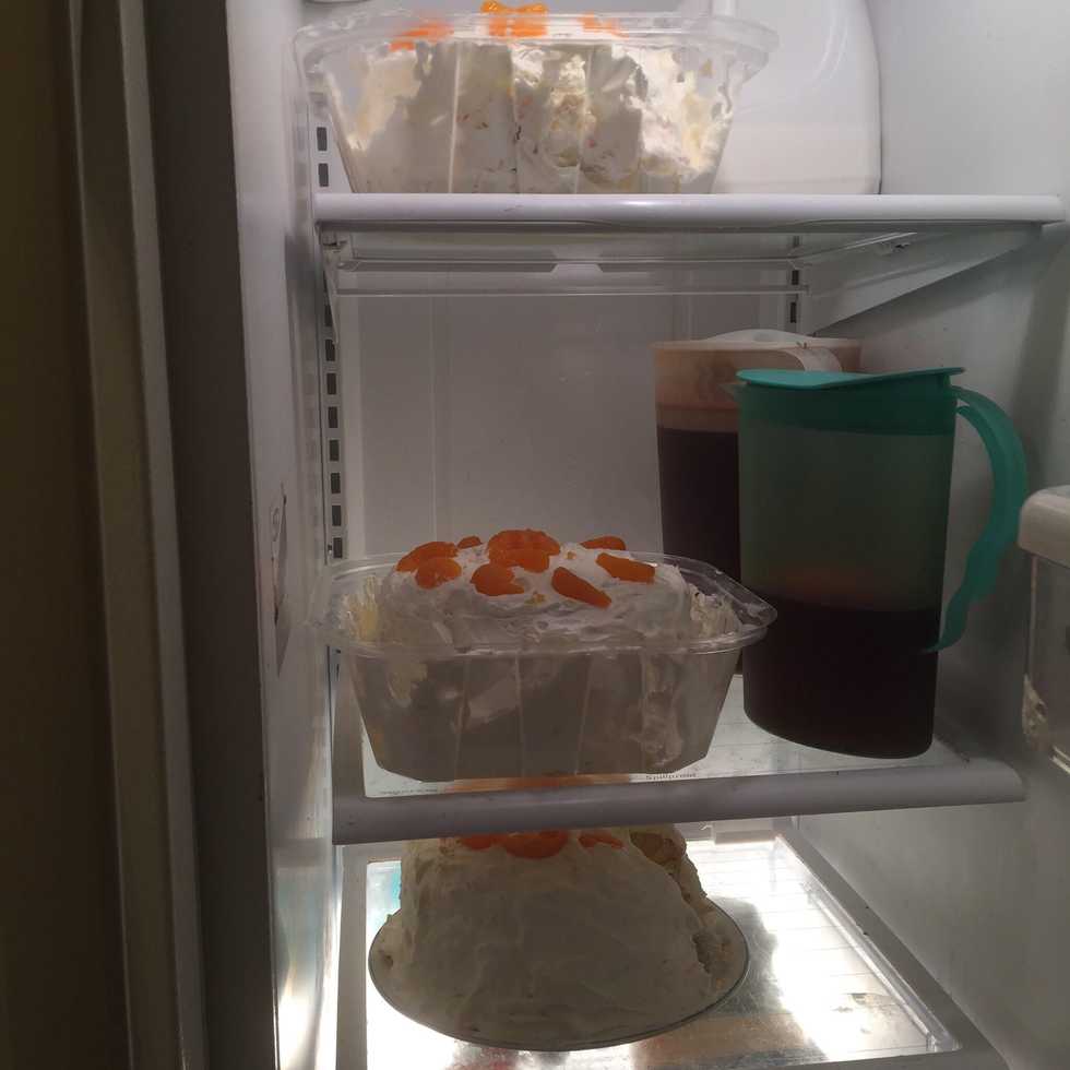 Garnish the cake with mandarin oranges from a jar (optional). This can be done with fresh mandarins, but it is done for aesthetics, and the ones from a jar are prettier.