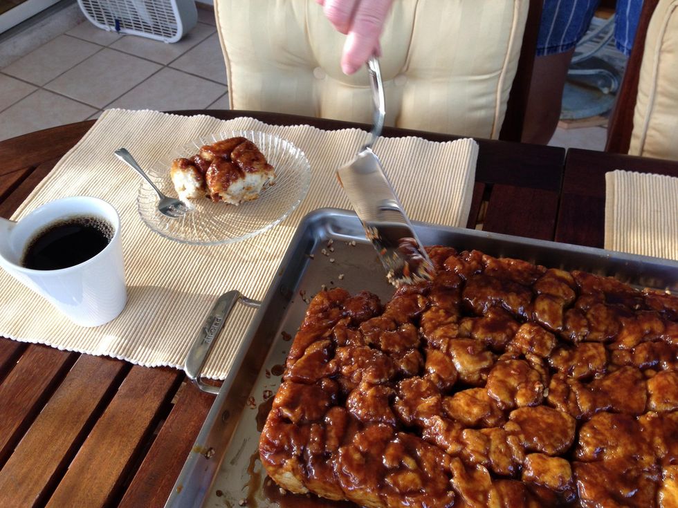 Turn the sticky buns out onto a serving tray or platter - this is a small cookie sheet that works great to serve all kinds of good stuff.