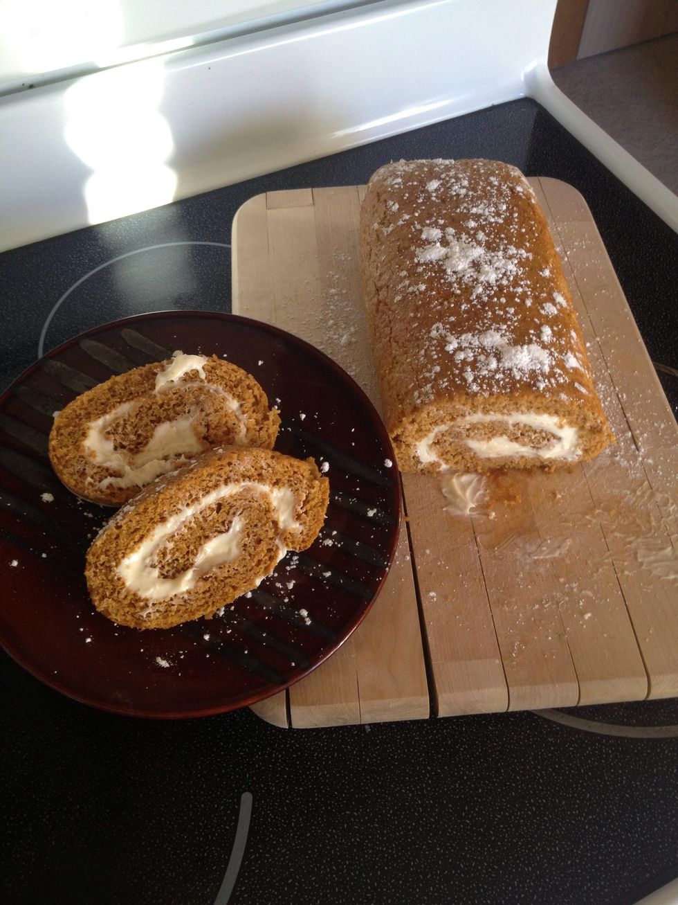 Beep beep. Time to unroll the pumpkin cake. You can let it cool a bit longer so the filling won't melt. Take your plastic wrap out and get ready to transfer the roll in it.