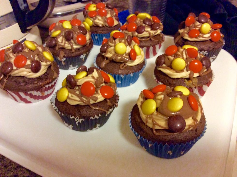 Make the ganache by melting together 1/4 cup chocolate chips and 1/2 cup smooth peanut butter to drizzle on top of your buttercream. Then top with some extra Reeses Pieces as decoration