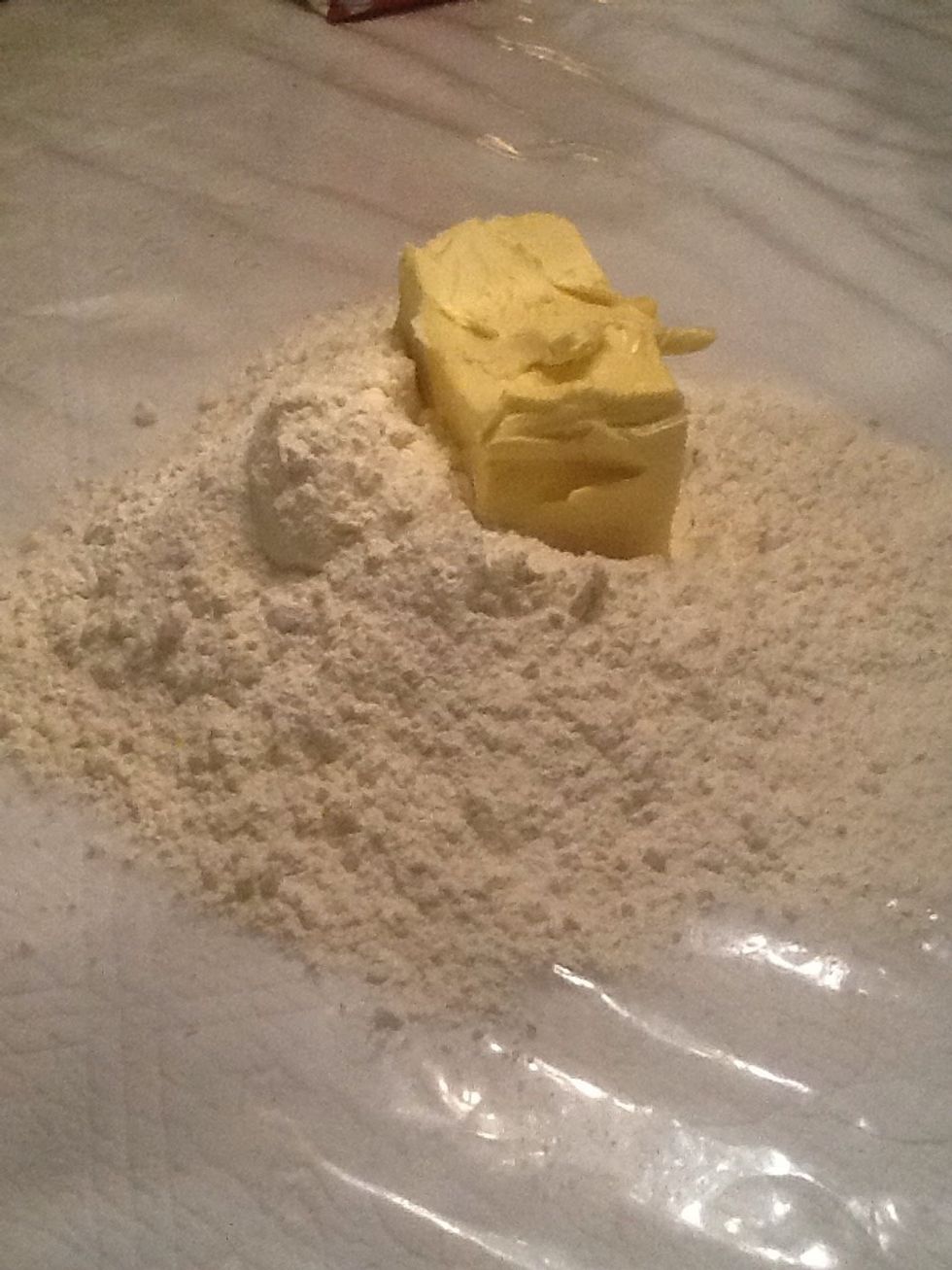 Pour the flour on the table like this and take the butter on it. Mix it with your hands.