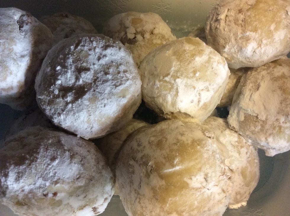 Cool them on a cooling rack, then roll them in the remaining 1/3 a cup of Confectioners Sugar. Let them sit for about 10 minutes and roll them in the Sugar once more.