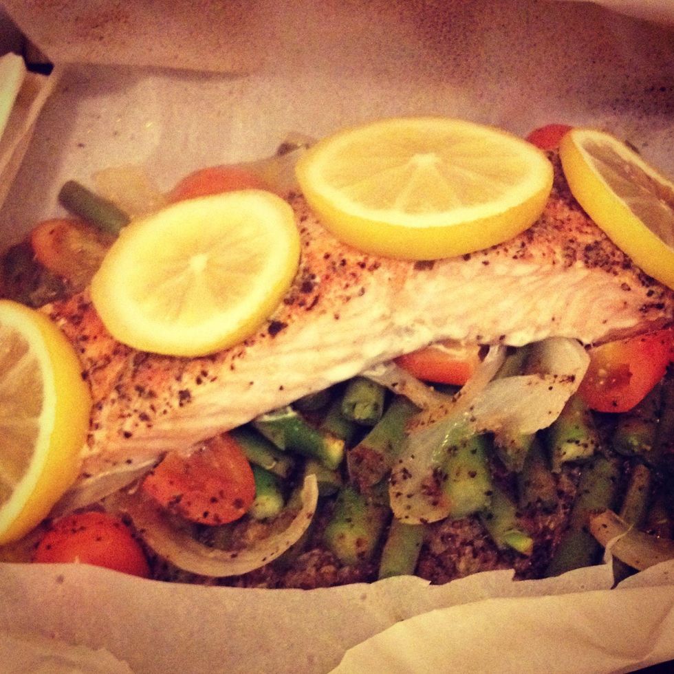 Remove from the oven and cut open the parchment paper. Carefully transfer the entire packet to a plate and serve as is. Sprinkle on some goat cheese and/or more lemon as you like!