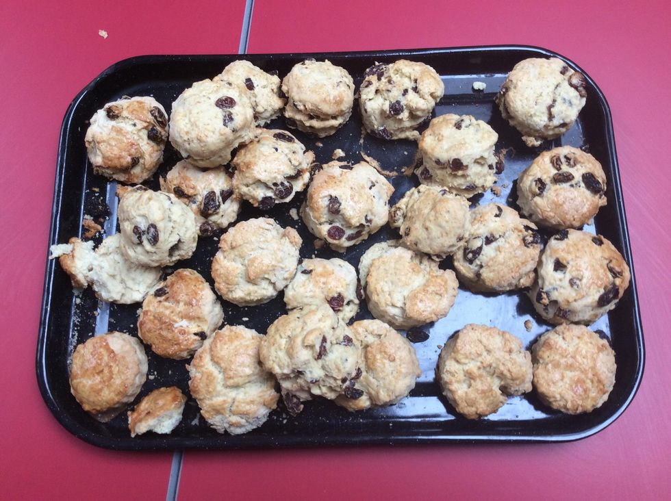 Then add the milk and make a dough. After that roll out the dough to 2cm thick and cut out rounds. Glaze with a beaten egg. Bake for 12-15 mins at 220 degrees.
