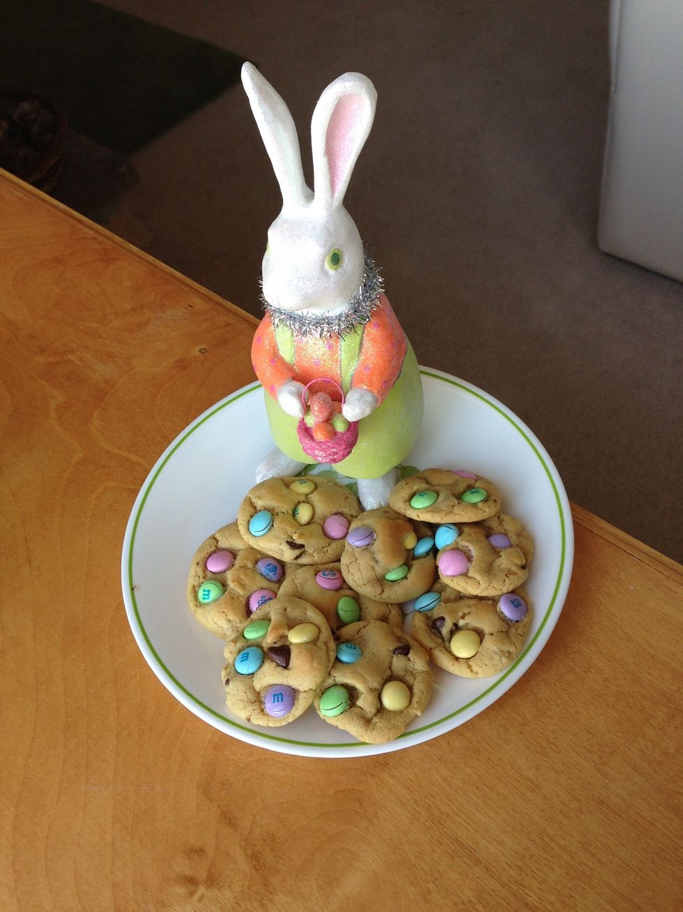 Top with M&M's, pressing in slightly, but keeping dough rounded. Bake 375° 8-10 minutes. (My oven seems to run warmer. I do 7 minutes.) I suggest 8 rather than 10.