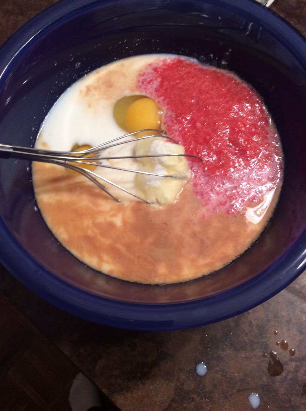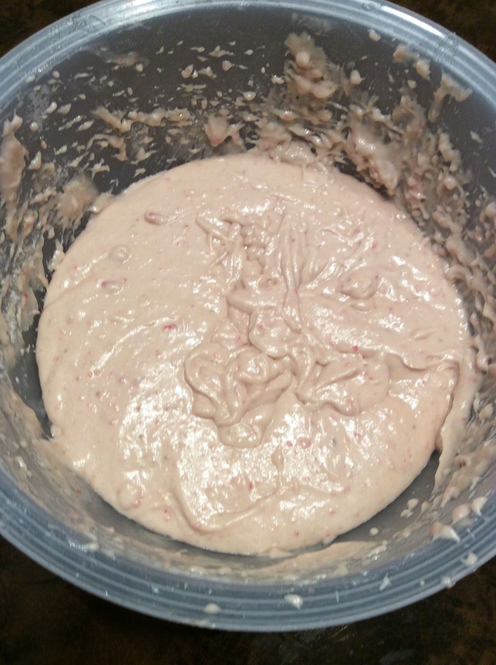 Melt butter in a large microwave safe bowl on medium power for about 30-60 seconds. Stir in sugar, then stir in egg, yogurt, milk, vanilla, and ½ cup strawberry liquid puree (not the chunks yet).