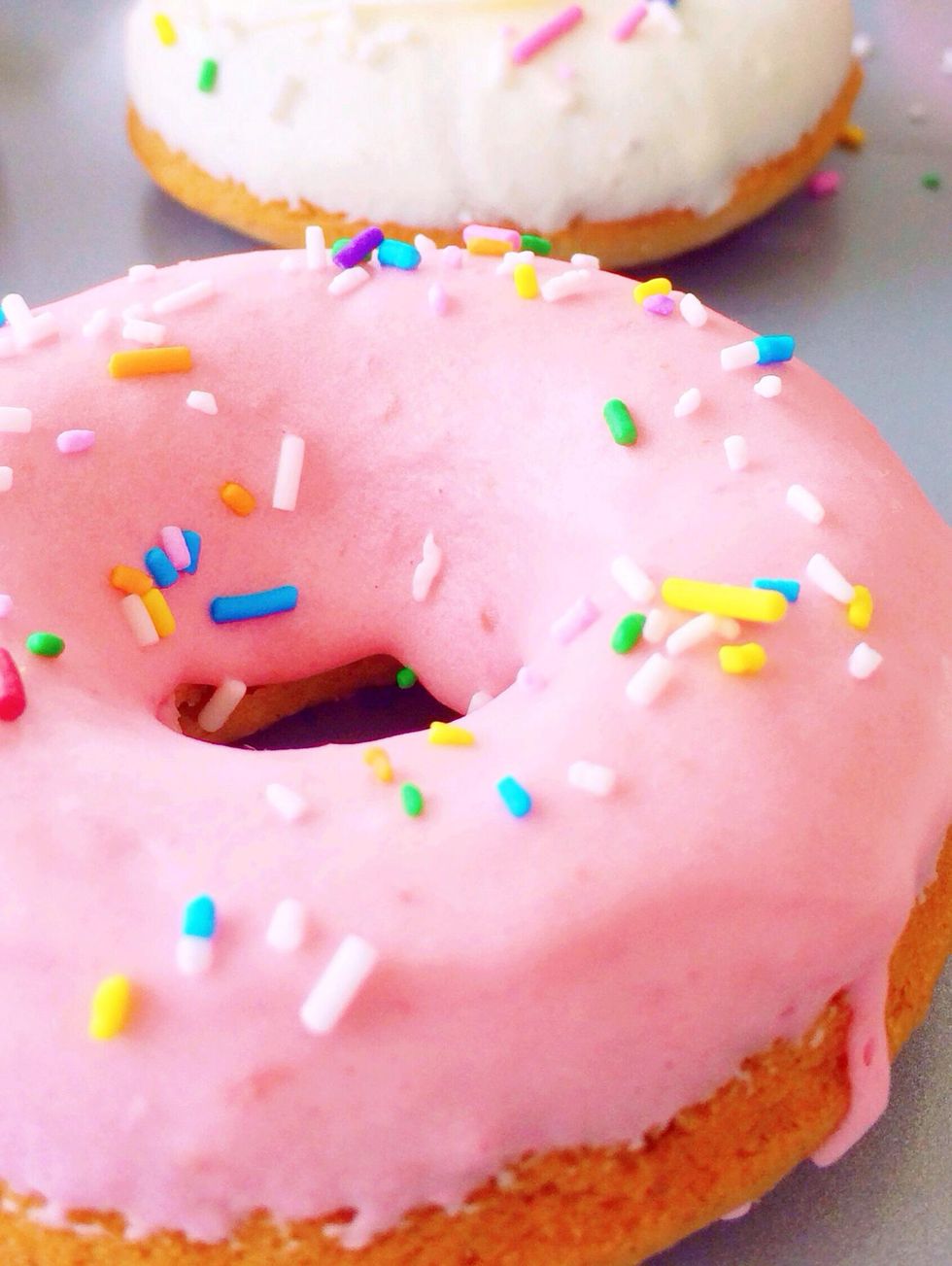 Bake donuts at 350F for 10 minutes or until golden. Prep icing while they are baking. (1 c icing sugar, 1 tsp vanilla, 3 tbsp water) you can add cocoa or strawberry purée to the icing too.