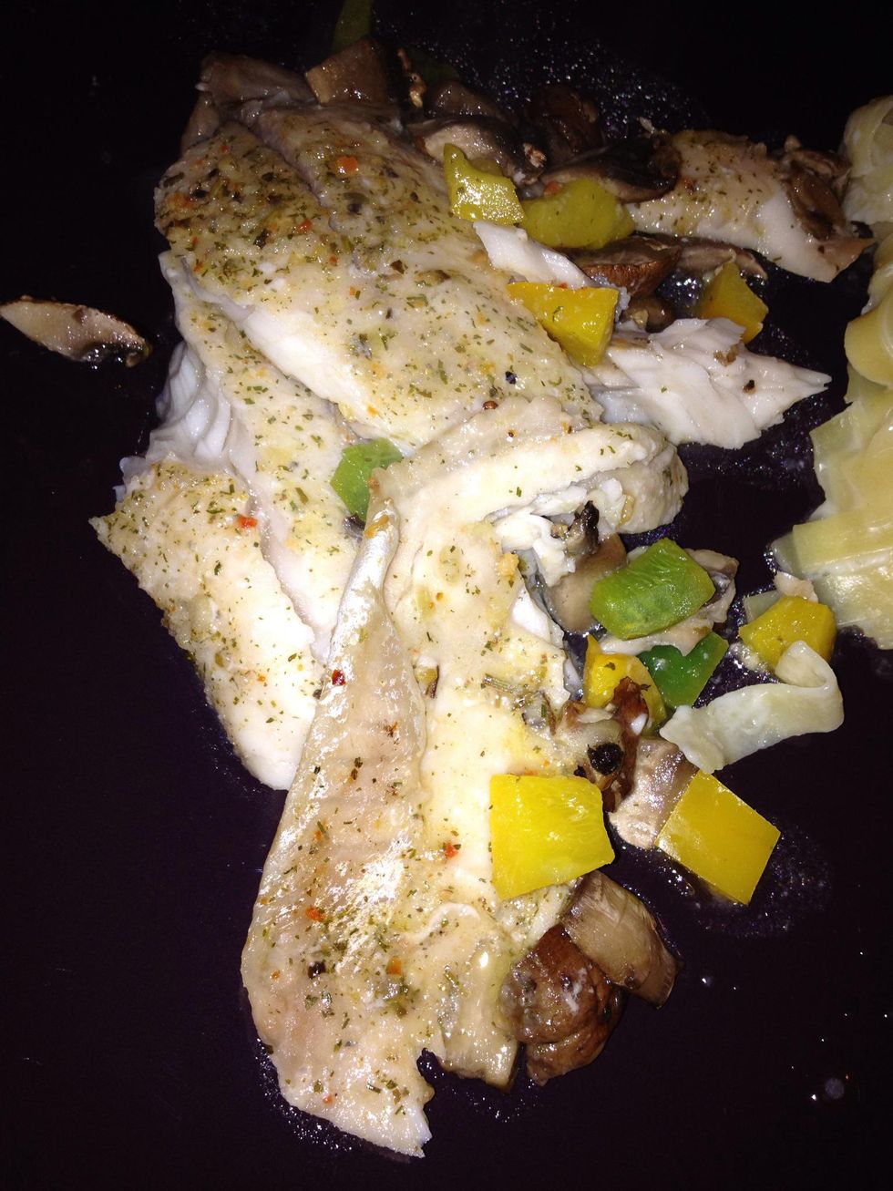 Place the pan into the oven and cook for about 15mins (depending on the thickness of your fish). You want the veggies to be tender and the fish to flake off easily when pulled with a fork.
