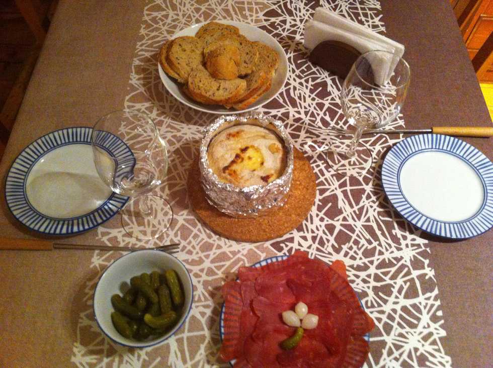 To serve, place the cheese box onto a serving plate and eat like fondue style with gherkins (pickles), pickled pearl onions, slices of dried meat and bread