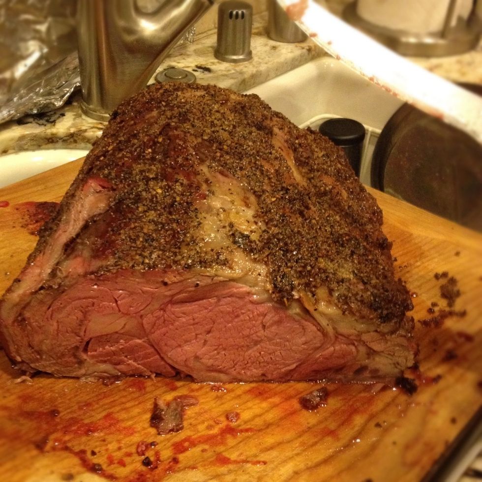 See the crust that's formed?? Nice!! Take prime rib out when internal temp of prime run has reached 120-125 degrees and let sit for at least 30minutes!