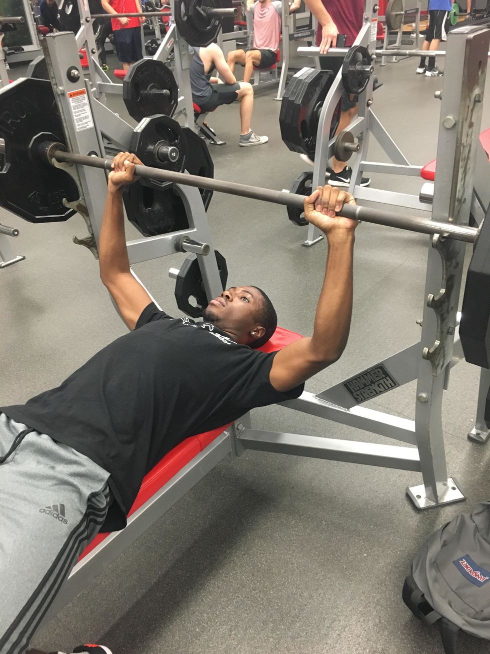 Locate a proper bench with all equipment including the bench, bar, weights, rack, and safety clips