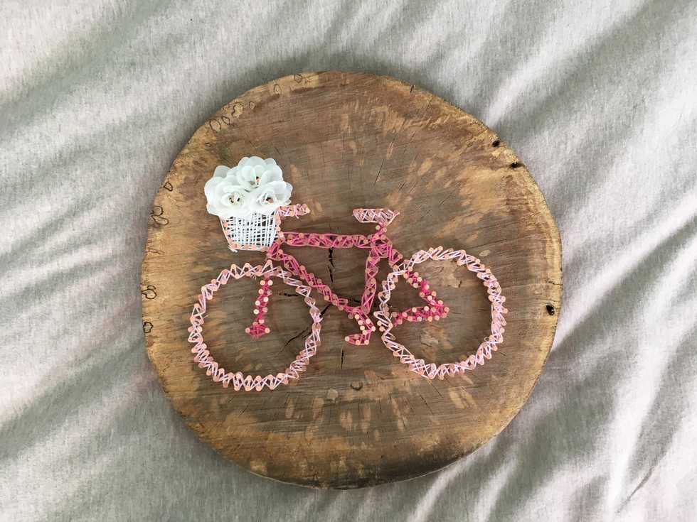 Now it is time for threading. Choose the colors of string you want to use. For my bike I ended up using different shades of pink for the bike and white string for the basket.