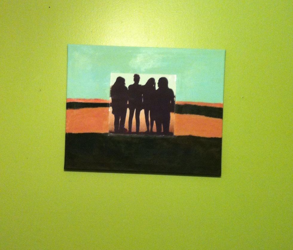 Cut the picture and Mod Podge the copy to the center of the canvas. Using a paper plate, mix the color until you have an exact match.