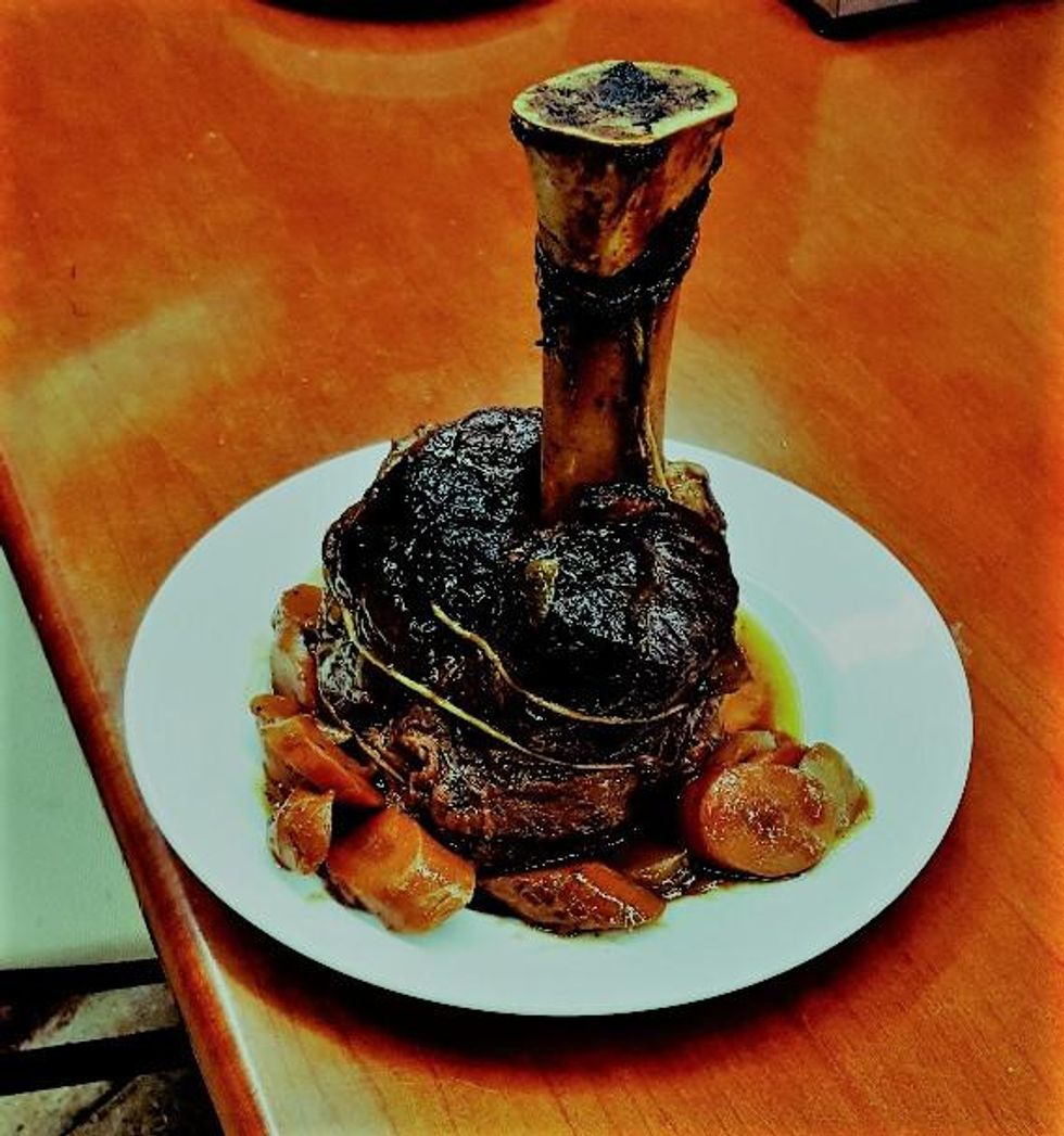 Stand shank up in pan. High temp sear. Combi 500F. 12 min. 80 fan. 100 hum.