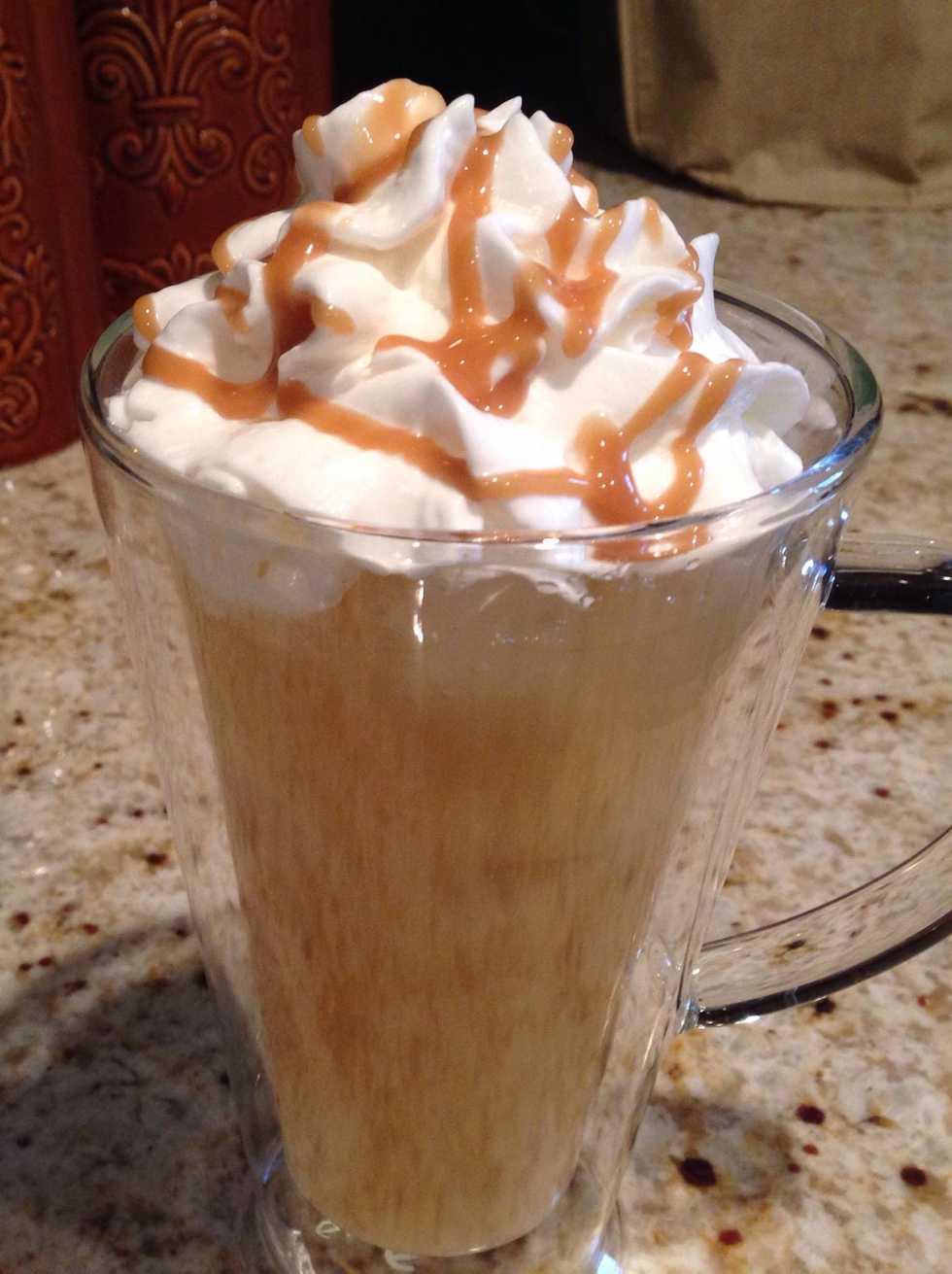 Next, you need your cooled cider, glass of ice (with milk), whipped cream and caramel sauce.