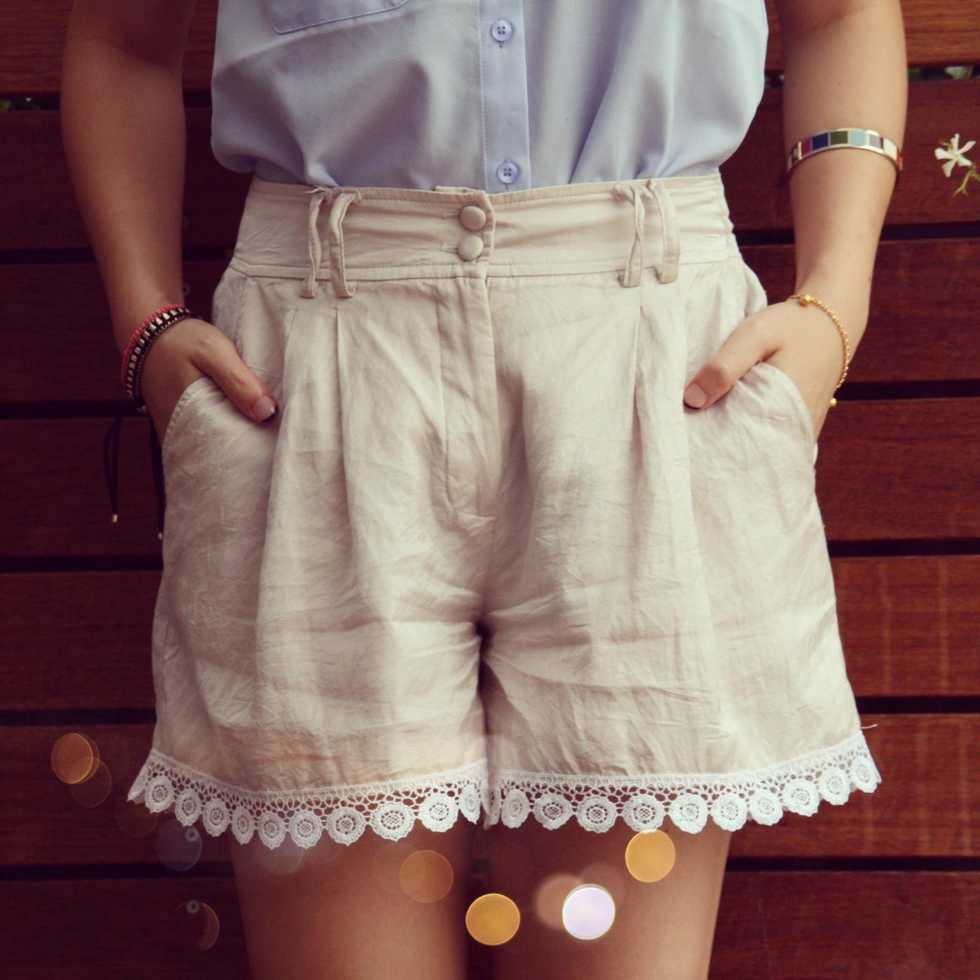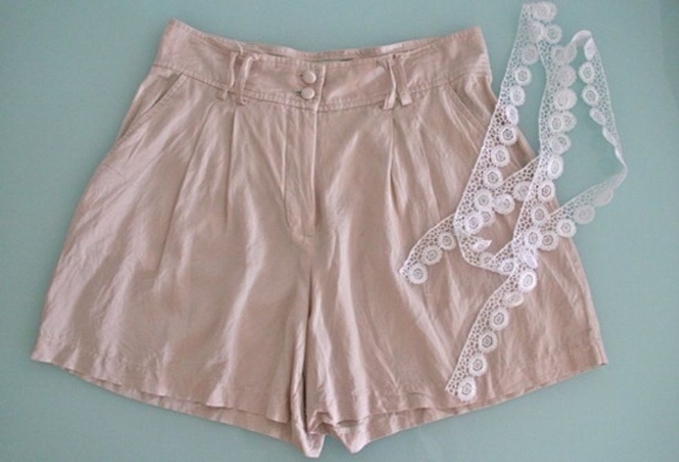 Place the trim along the hem of your shorts and sew. For those not so confident in sewing, pin down the lace before you start sewing.