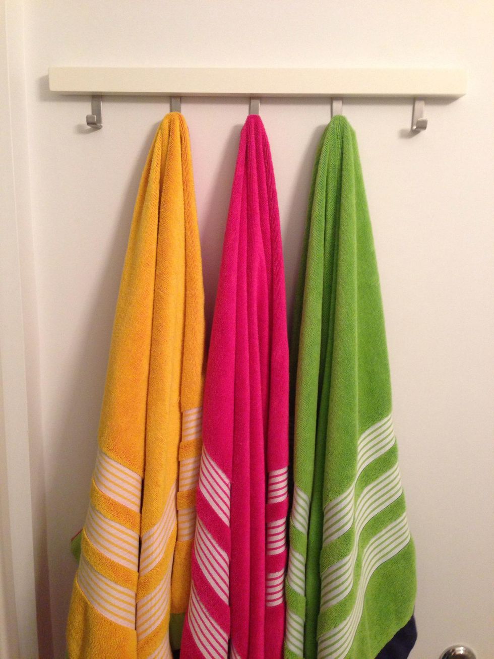 Bold and bright extra large and fluffy bath towels, hung up besides the bath, will keep the kids clean, warm and happy!