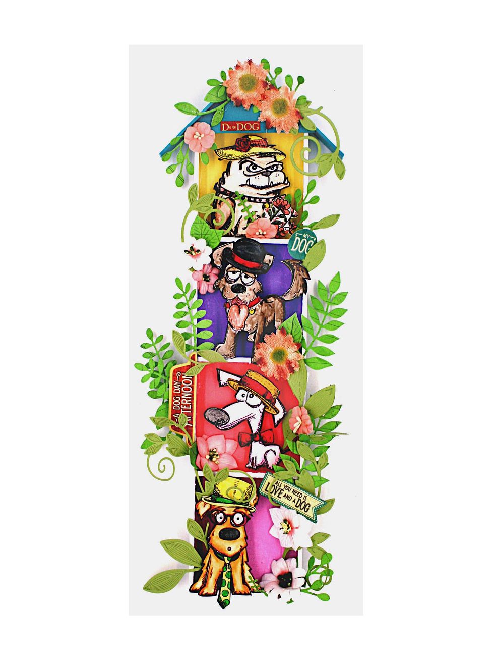 Place some flowers and vines such that they are peeking out from behind the pups. Use some stickers and chipboard from Graphic 45's Raining Cats & Dogs collection to dress it all up.