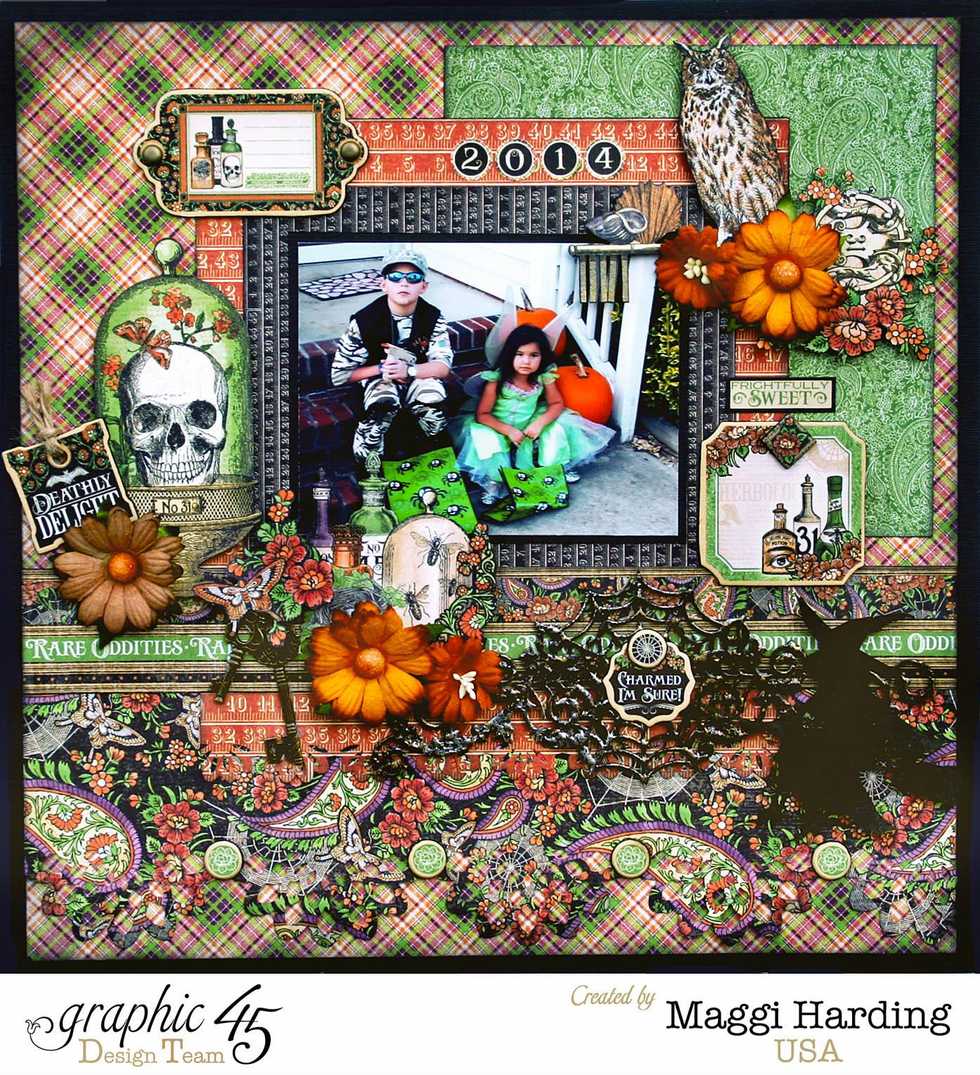 Add chipboard pieces as desired, top left, to the right of the photo and left of the skull dome. Embellish the border cut with small round chipboard pieces as shown near the bottom. Add flowers.