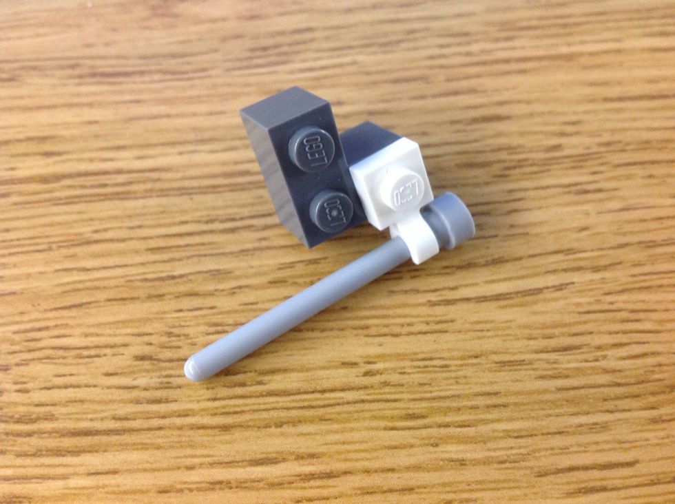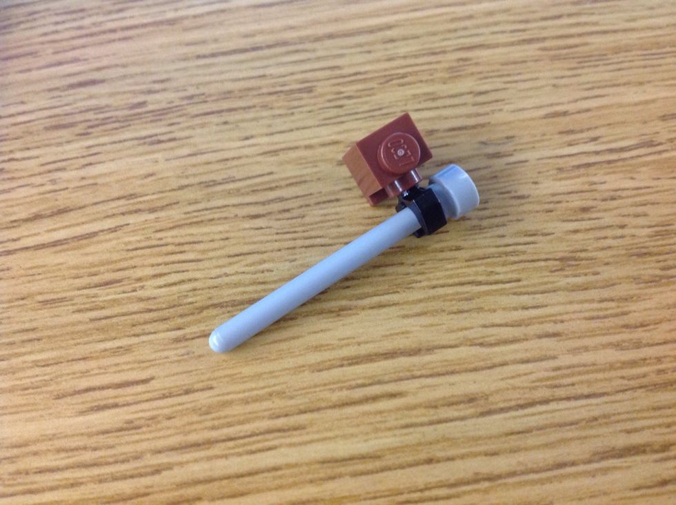 Now, take a 1x1 brick with hole in it, take a claw piece and the other pole part, and connect them like this.