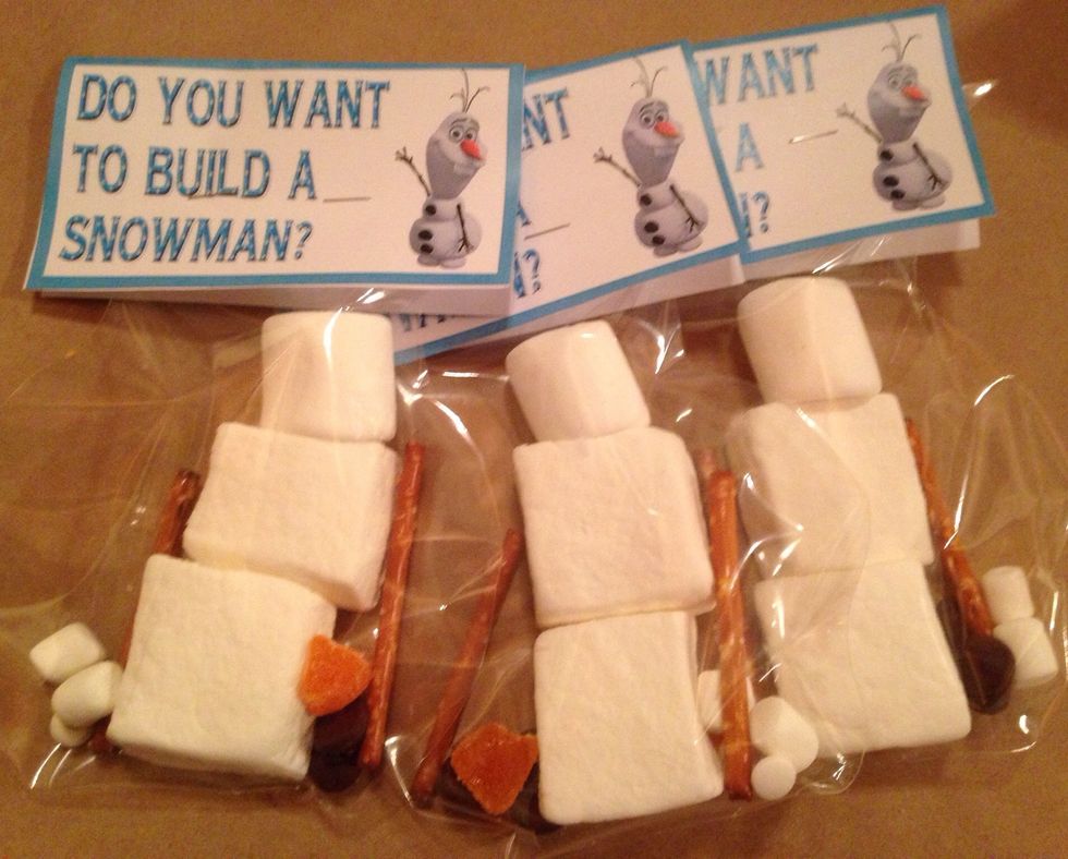 Add to bag: -2 large, 1 medium, & 2 small marshmallows. -3 chocolate chips, 1 orange candy slice, 2 candy eyes, 2 pretzel sticks.