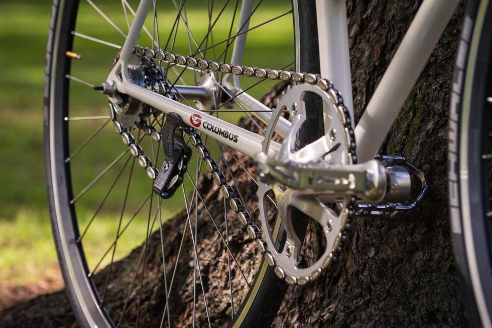 Note: chain crosses over top of both freewheels.