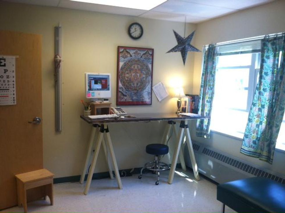 Finished Standing Height Desk. Perfect for busy health office. Est Cost of project: Door$75,Plexiglass$125,Wood& Brackets $40.