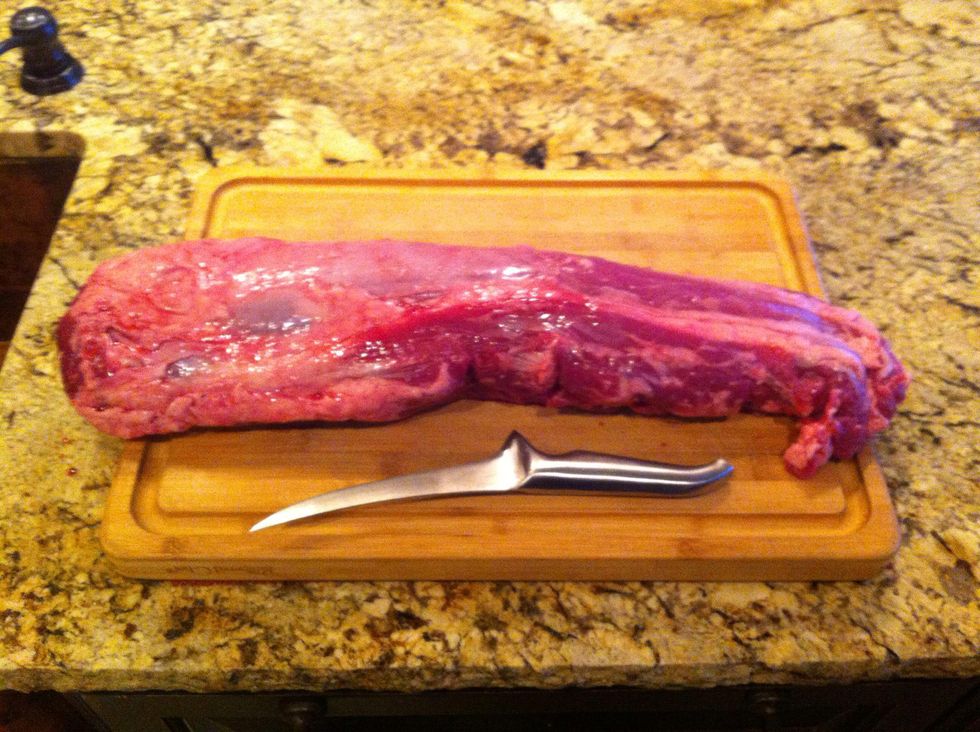 At the wide end of the loin there are three muscles that come together, and membranes that connect the three. Pull the smaller muscle towards you, exposing the membrane.