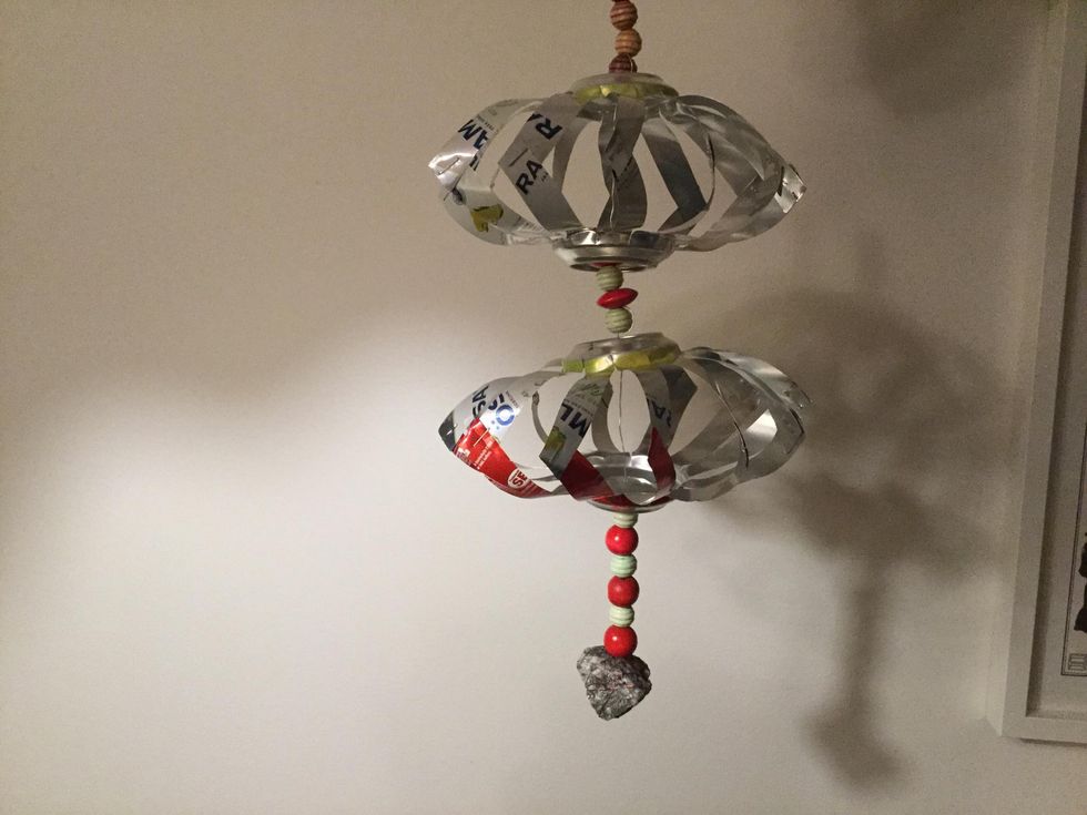 Gör en till vindsnurra av två burkar (steg 1-12). Trä den på ståltråden. Välj om snurrorna ska snurra åt samma eller olika håll genom att trä på den åt samma eller motsatt håll som den första snurran.