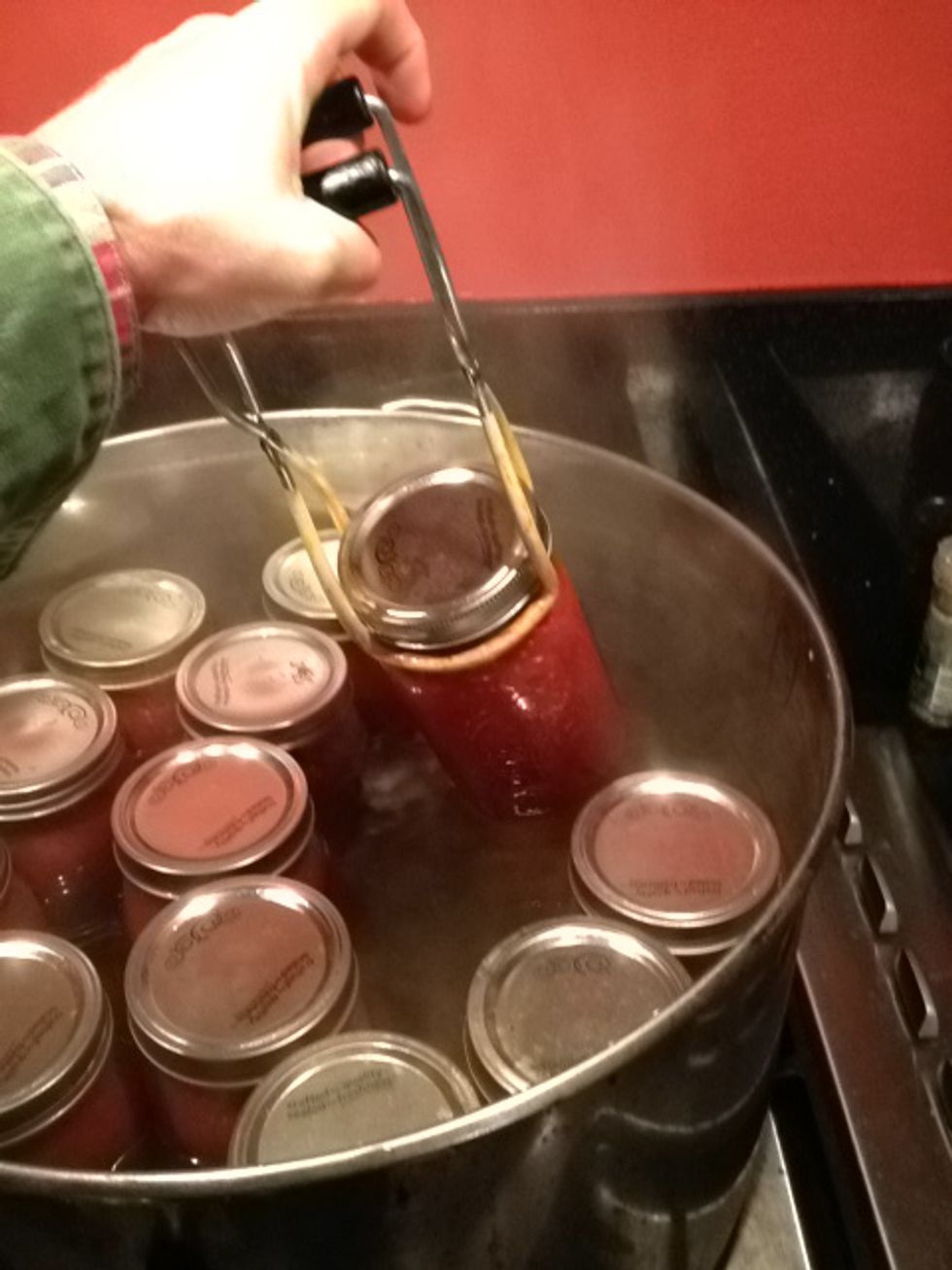 Fill jars w sauce, add to pot of boiling water. Make sure jars are covered by 2" of water. Cover pot, when water reaches rolling boil, boil for 45 minutes. Remove jars and allow to cool.
