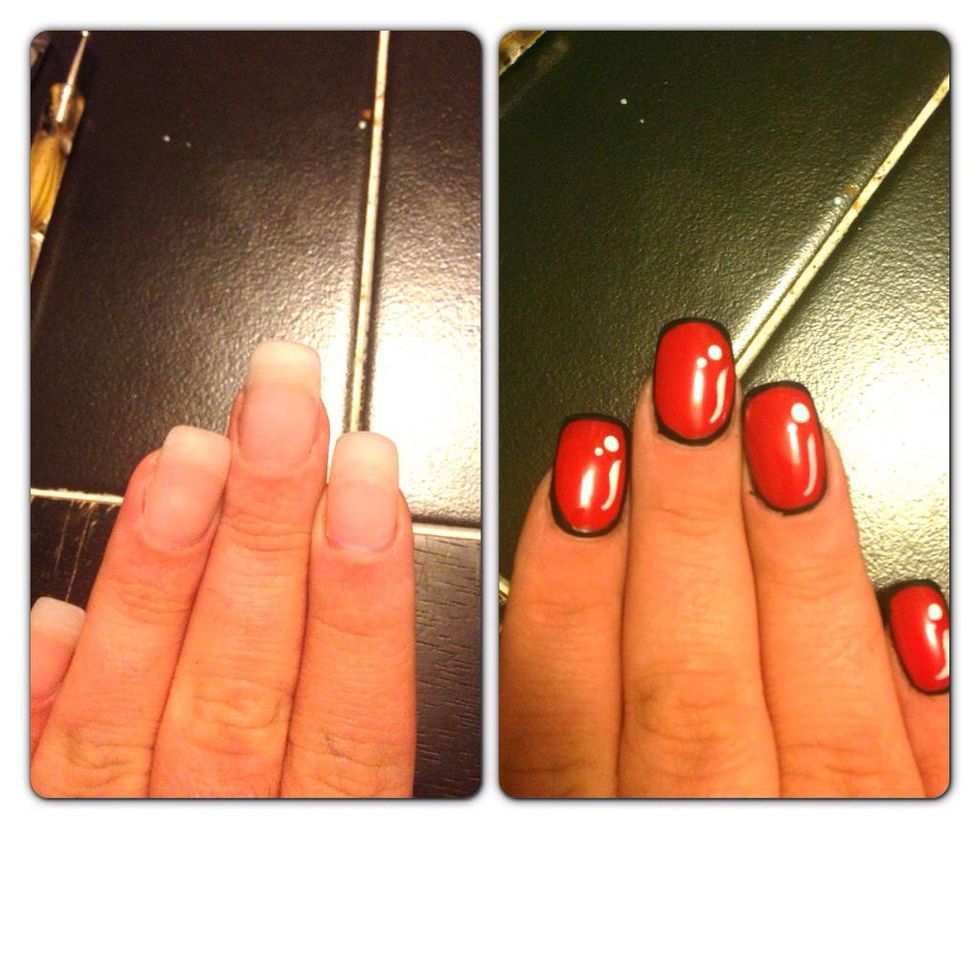 Start with a red color.Get a Striper and black paintOutline your nailAll nails :)Use a dotting tool to create white dots.Add a white stripeAll nails :)Add topcoat and you're doneSee the cartoon effect :)