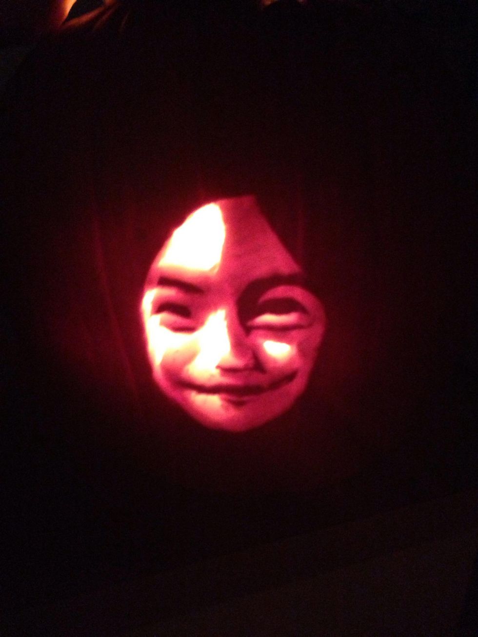 The cut out part was the white. The carved off skin is the gray and the remaining pumpkin skin was the black. Looks like crap right now. Don't worry! Put a bright light inside and...