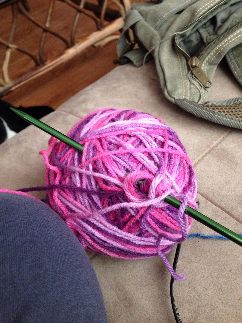 Put the needle through the hole and wrap the tail yarn around the needle. Pull the tail yarn back through the hole. Then slide the yard onto the needle.