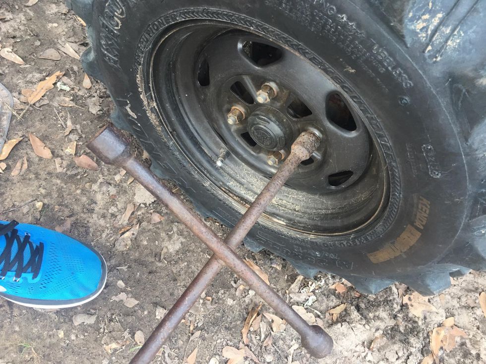 With your lug wrench loosen your lugs.