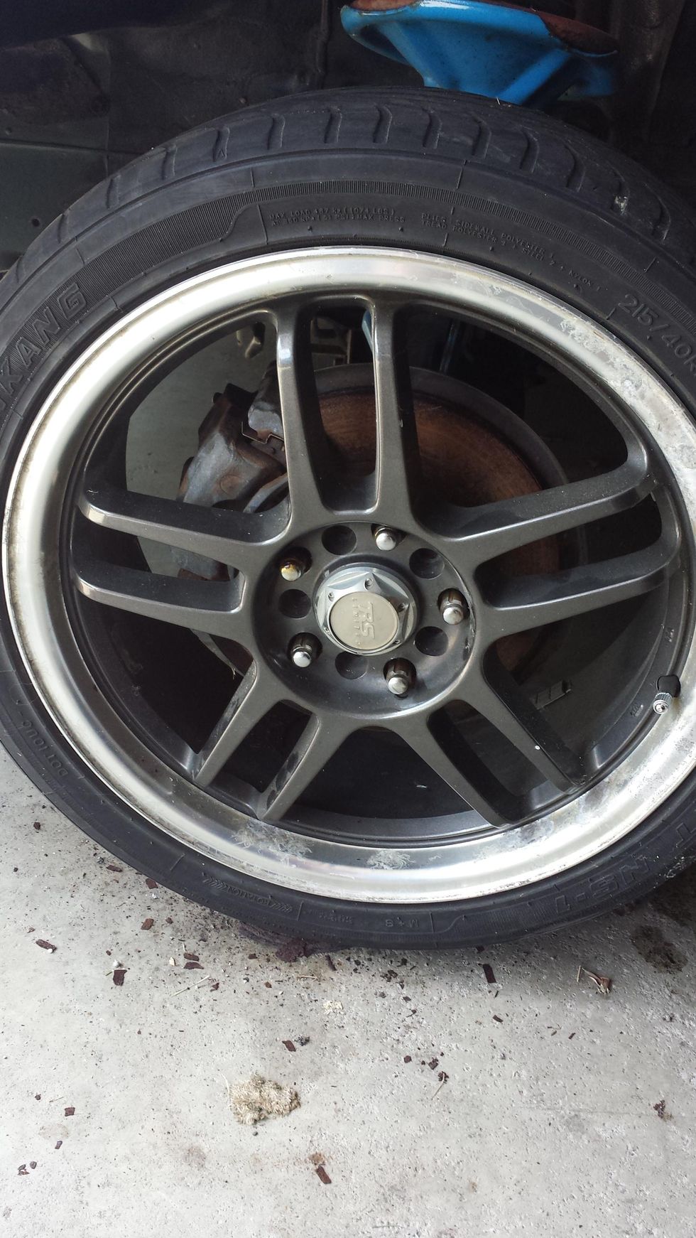 The last step is to put the wheel back on. Tighten the lug nuts on before lowering the car. Then when the car is back on the ground, re-tighten them to ensure they are on all the way.