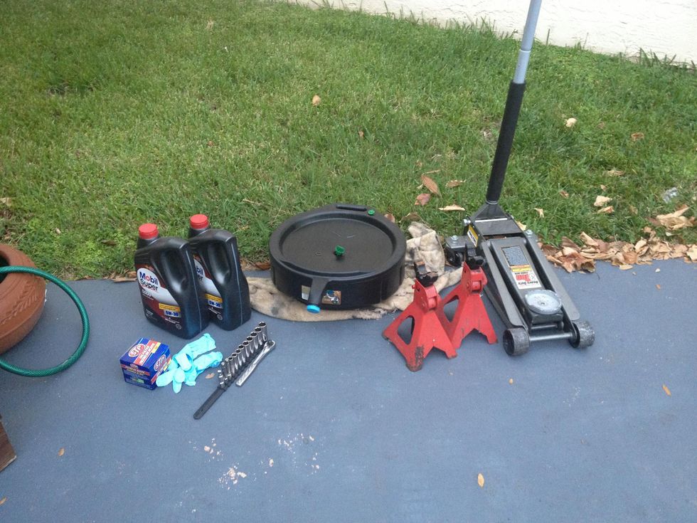 Supplies: oil, filter, wrenches/sockets, gloves, oil catcher, rags, jack stands and jack.
