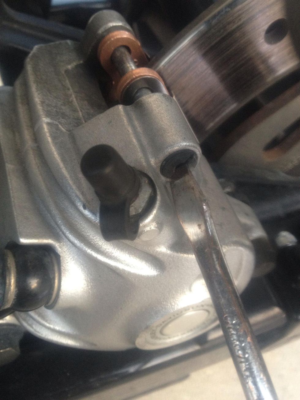 Press the side of the caliper to move the outside brake pad back to push the caliper piston back into the bore with the screwdriver carefully! Do NOT use too much pressure against the rotor.