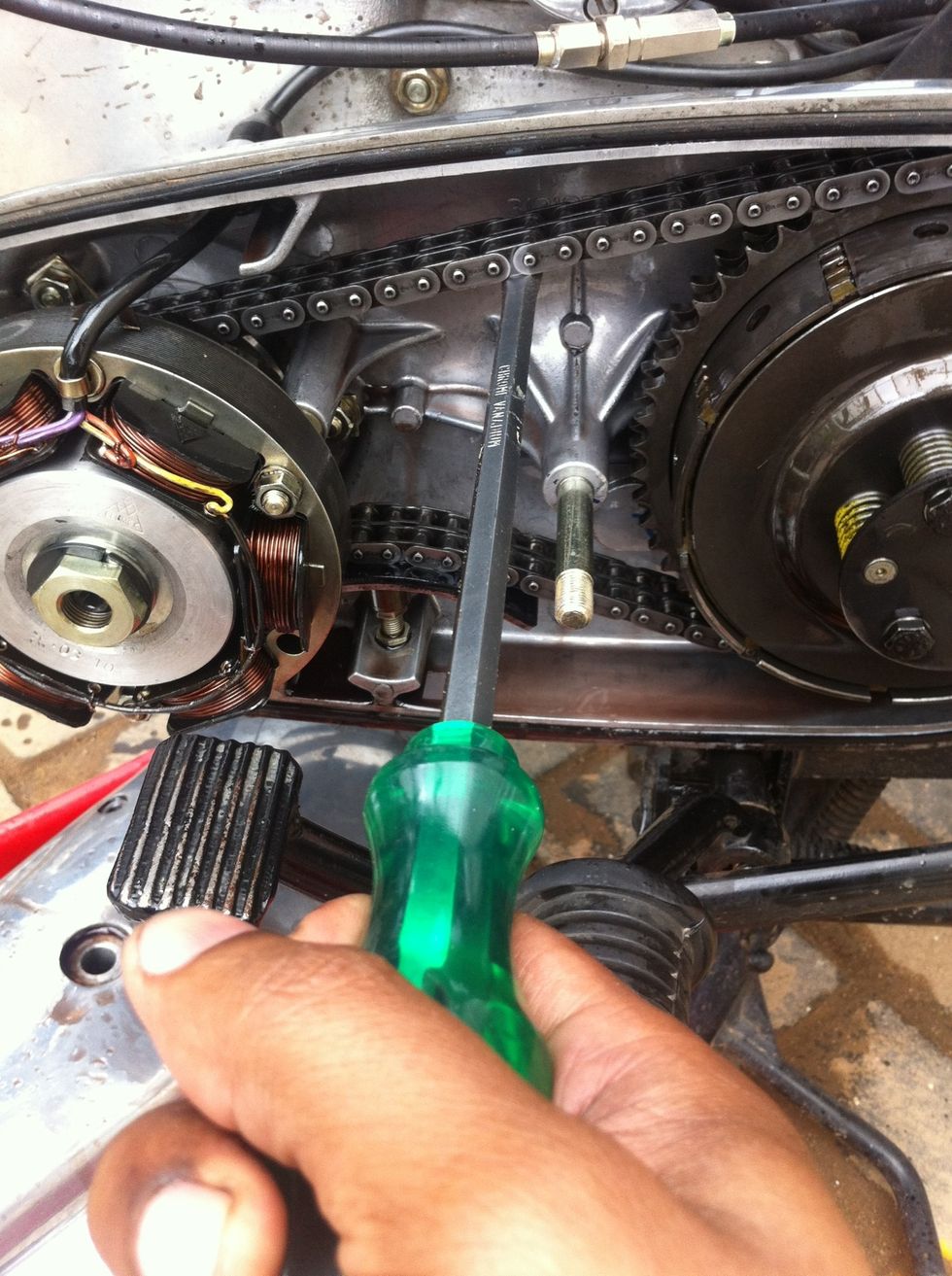 Insert a screw driver underneath the primary chain