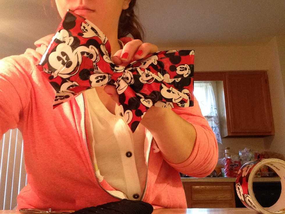 Cut two pieces of duck tape close to the size of the ribbon. (Will need to more pieces for the back)