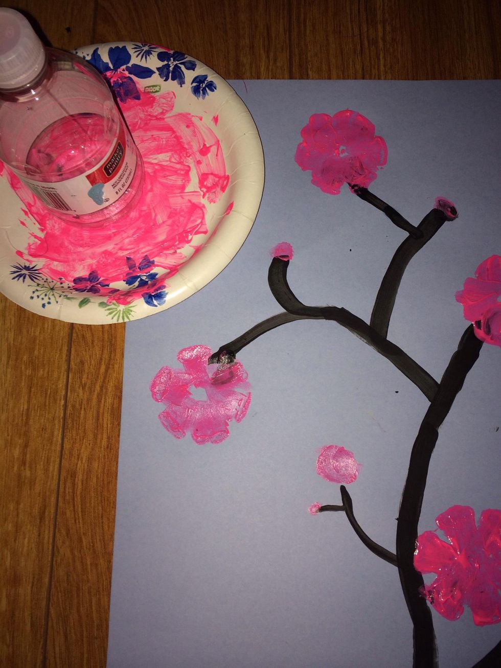 Press the bottle onto your poster paper. Then lift up gently. Keep dipping the bottle in more each time you add a blossom(: