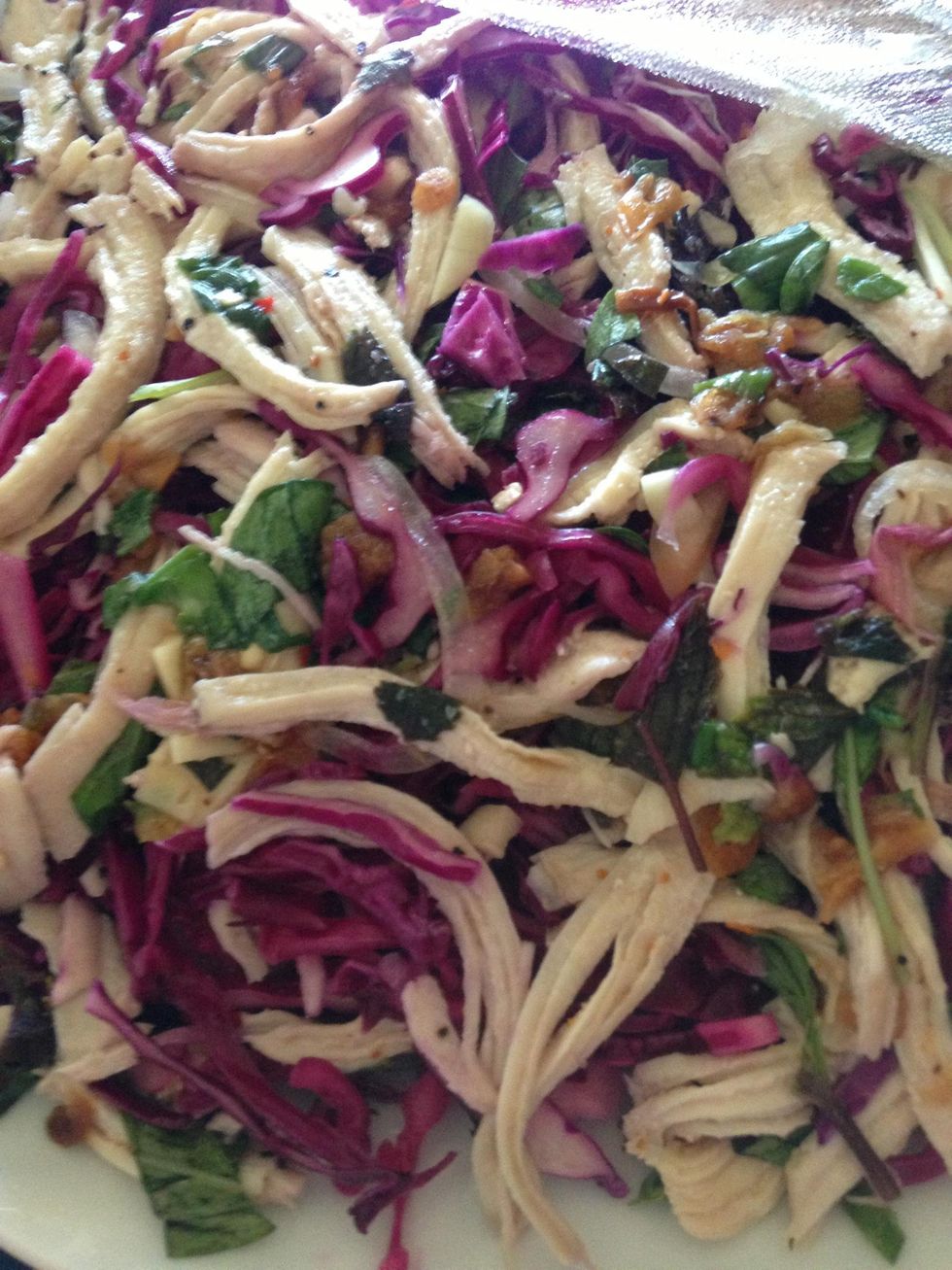 Boil the chicken breast, shred it and put seasoning (black, red pepper, salt, sugar), garlic powderCut up red cabbage, mix with vinegar and sugar. Mix shredded chicken, red cabbage, onion, mint togetherEat with these shrimp chips