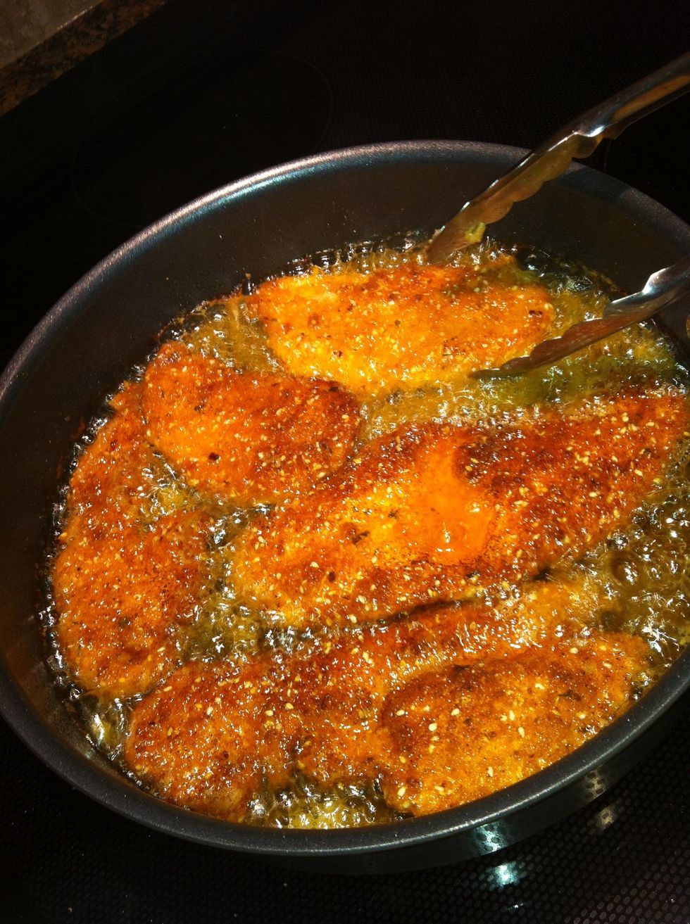 Frying time... (maybe I should spell it fr*ing time... It almost sounds like a swear word). Warning: if you skip this step and place the chicken in the oven you will miss out on the flavor