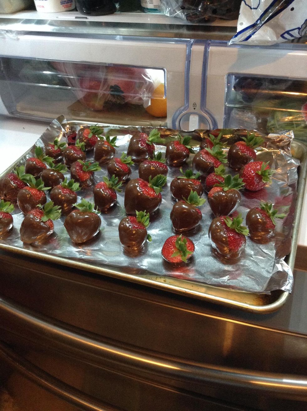 Melt your chocolate in a bowl over not quite boiling water.Once chocolate is melted, dip your strawberries put on a foil pan.Punt in to fridge and cool. Then enjoy!Please follow me if you want to see more chocolate!