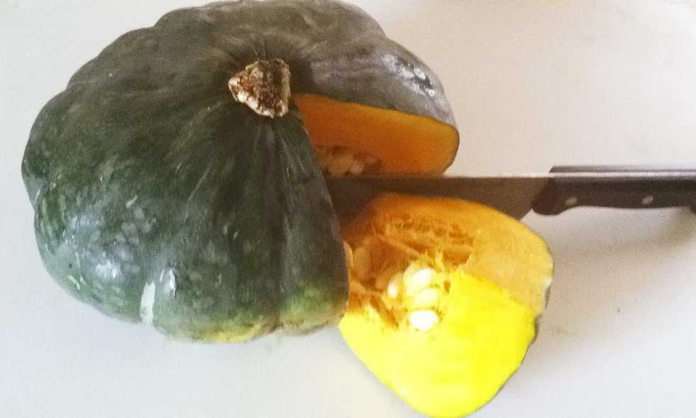 Carefully holding on to one side of the calabaza, press and insert knife and slice down onto cutting board.