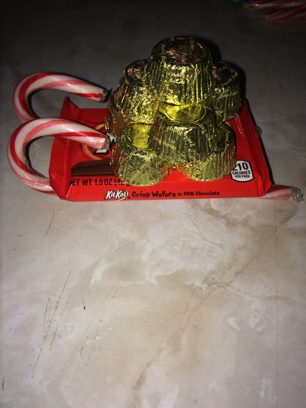 And then add your last chocolate candor to the top (again, hot glued) and now your done you have a candy sleigh you can add ribbon if you want
