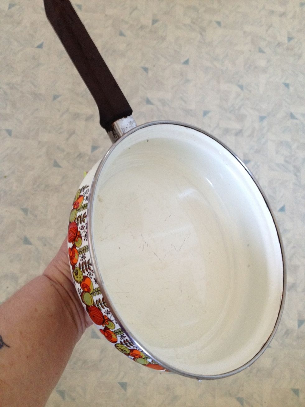 Ta da! My pan is clean! Note the design on the sides. I forgot it even had this - they were hidden under the stain! ¡Gracias, Amparo! You rock!