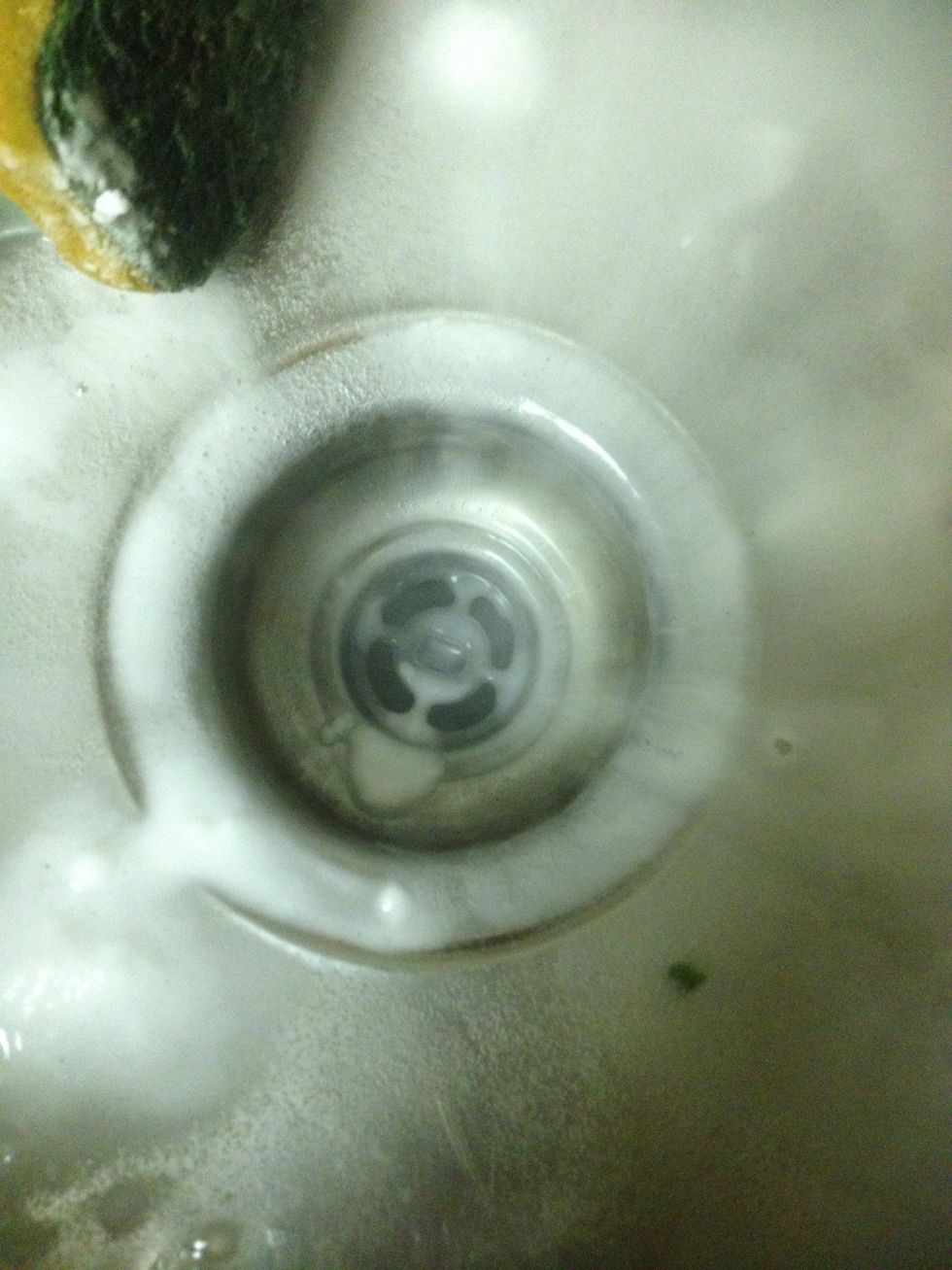 Pour the vinegar into the sink slowly. It'll fizz up like a grade school volcano. Vinegar is a safe and natural disinfectant and the fizzing helps remove grime caught in your drain!