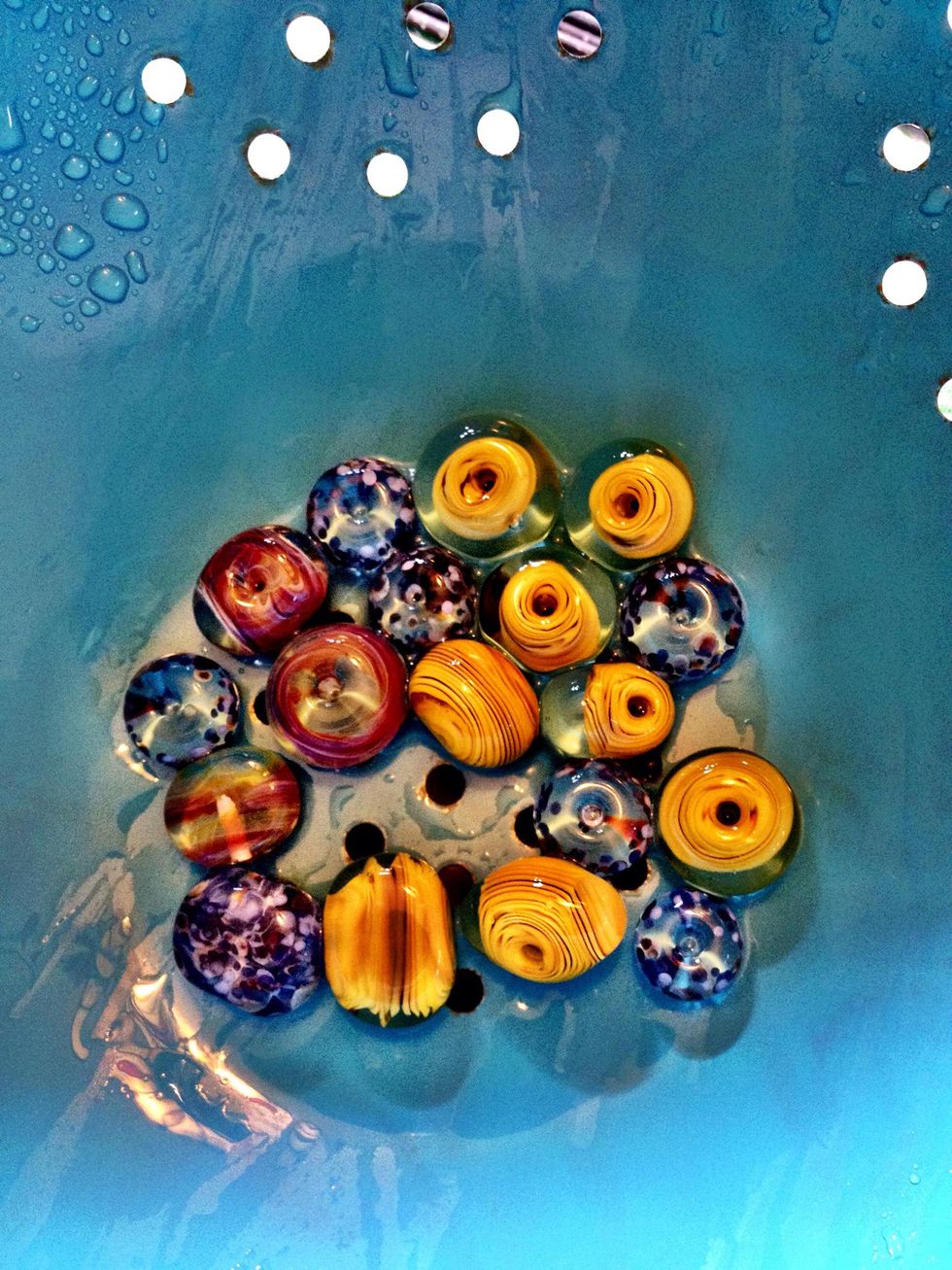 Once your beads have gone thru the full annealing cycle it is time to clean them, this is how they look fresh out of the kiln.