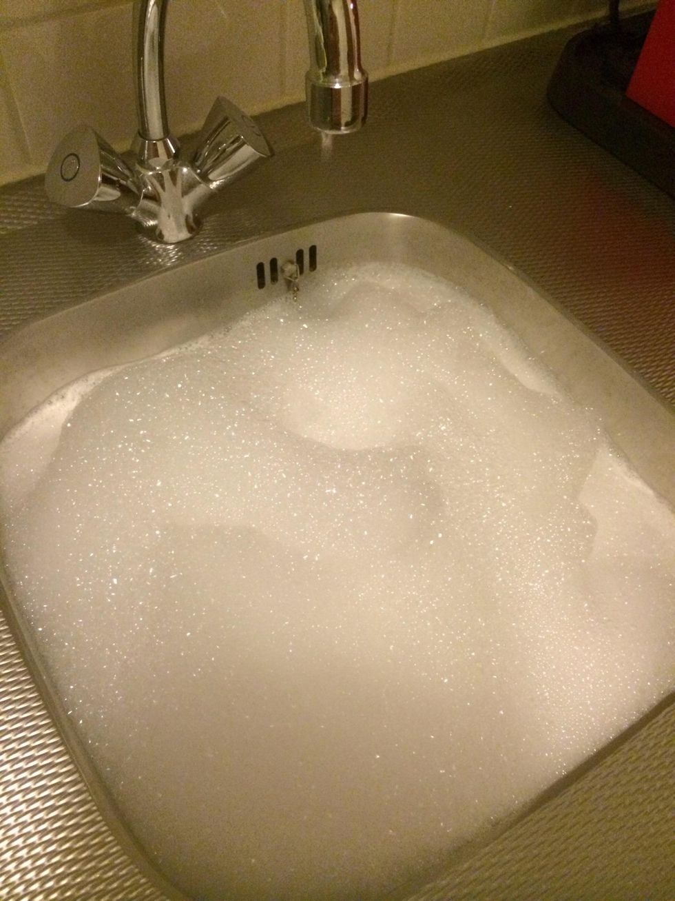 Put in any mugs that need cleaning and make sure they sink to the bottom. Feel free to add as many mugs as your sink allows!